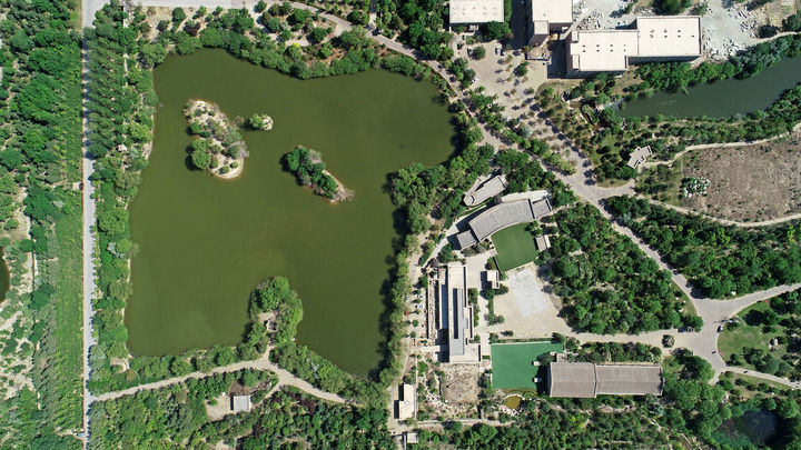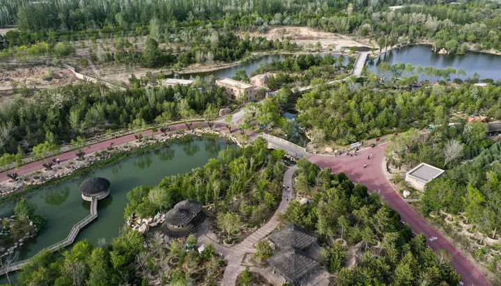 这是志辉源石酒庄与政府共建的贺兰山运动休闲公园,这里曾经是一片矿坑(5月13日摄,无人机照片)。新华社记者 冯开华 摄