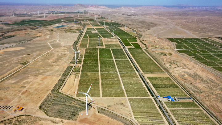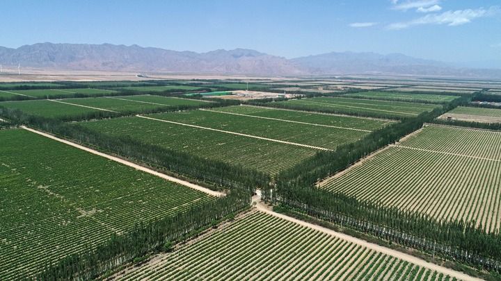 这是位于宁夏青铜峡市的西鸽酒庄酿酒葡萄种植基地(6月7日摄,无人机照片)。新华社记者 冯开华 摄