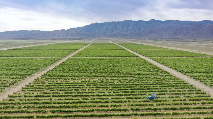 一辆拖拉机在位于贺兰山下的中粮长城天赋酿酒葡萄种植基地进行除草作业(6月5日摄,无人机照片)。新华社记者 冯开华 摄