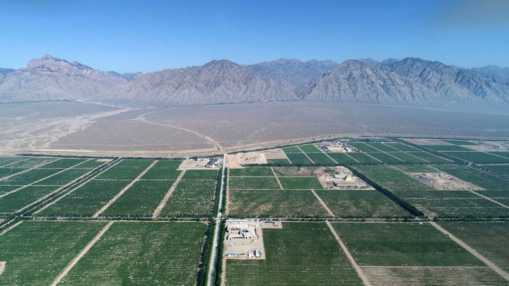 这是位于贺兰山脚下的部分酒庄和酿酒葡萄种植基地(6月8日摄,无人机照片)。新华社记者 王鹏 摄