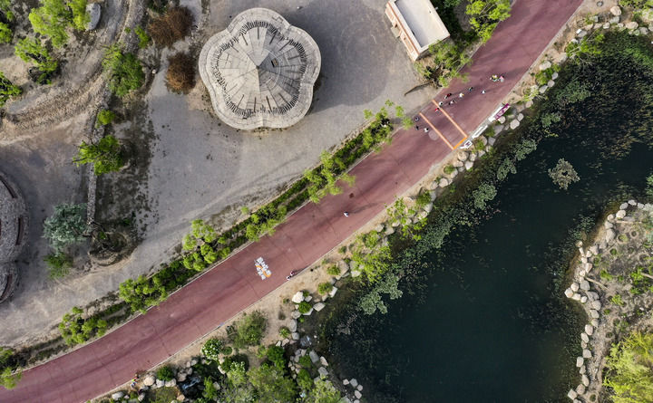 市民在贺兰山运动休闲公园散步游览(5月13日摄,无人机照片)。新华社记者 冯开华 摄