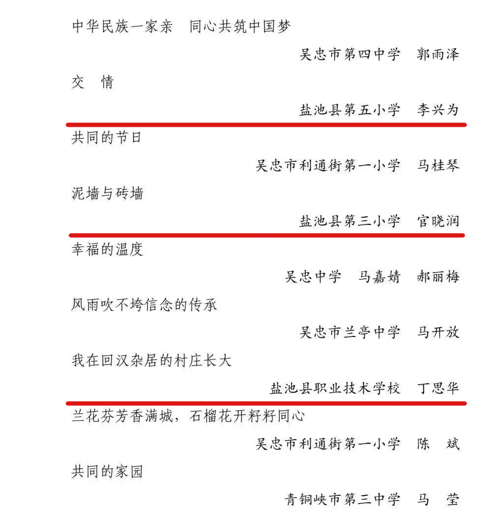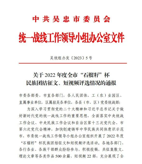 近期,吴忠市委统一战线工作领导小组组织下发《关于2022年度全市“石榴籽”杯民族团结征文、短视频评选情况的通报》,发布了“石榴籽”杯民族团结获奖征文43个,获奖短视频6个,优秀组织单位6个。盐池县4件征文作品被评为“石榴籽”杯民族团结获奖征文,名单如下: